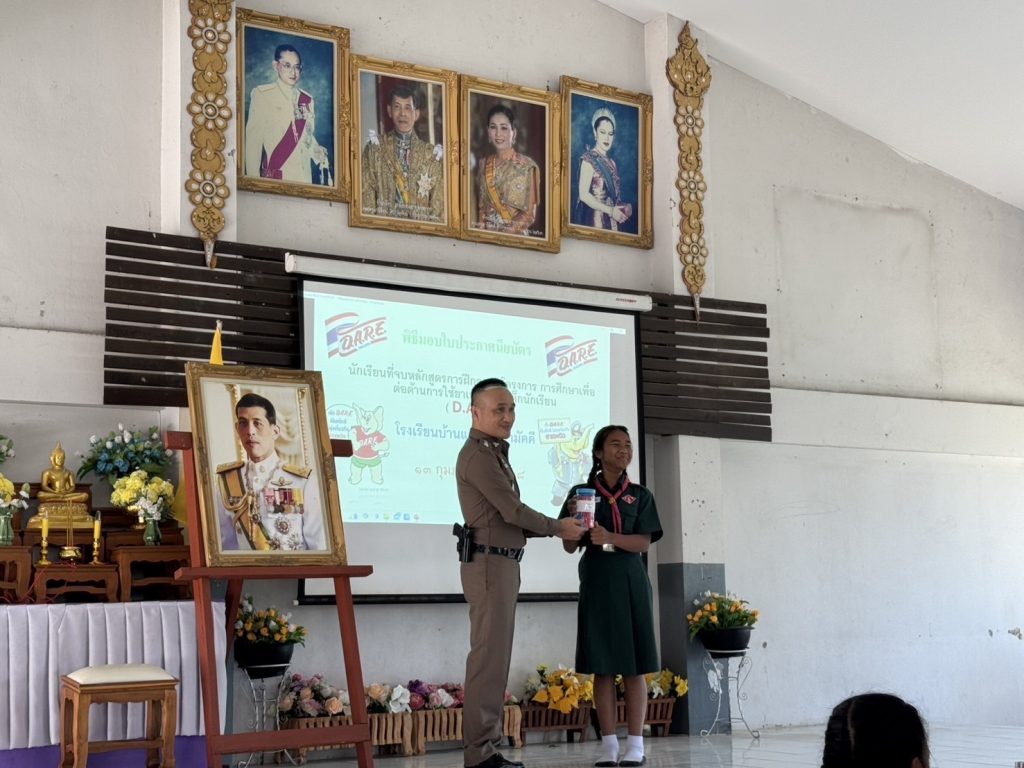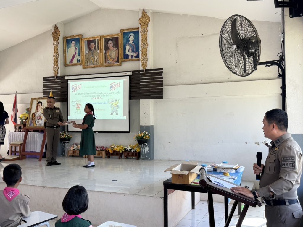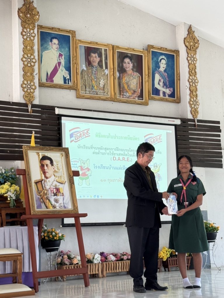ผู้ดำเนินการ ร.ต.อ.พันธ์ พันธ์หนองหว้า รอง สว.สส.สภ.เมืองเชียงใหม่ ครูตำรวจแดร์ รหัส 25201 และ ชุด ปส.สภ.เมืองเชียงใหม่ ,ชุด ชมส.สภ.เมืองเชียงใหม่ ,ชุด Local cat สภ.เมืองเชียงใหม่สถานที่ โรงเรียนบ้านแม่เหียะสามัคคี ต.แม่เหียะ อ.เมือง จ.เชียงใหม่ผลการปฏิบัติ พิธีมอบใบประกาศนียบัตร และปิดการฝึกอบรมโครงการ การศึกษาเพื่อต่อต้านการใช้ยาเสพติดในเด็กนักเรียน (D.A.R.E.) โรงเรียนบ้านแม่เหียะสามัคคี นักเรียนชั้น ป.5 และ ป.6 นักเรียนทั้งหมด 37 คน
