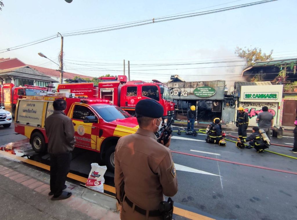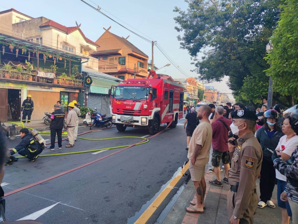 พนักงานสอบสวนผู้รับผิดชอบ ร.ต.ท.ธนากร ฮั่นเกียรติพงศ์ ตรวจที่เกิดเหตุเพลิงใหม้