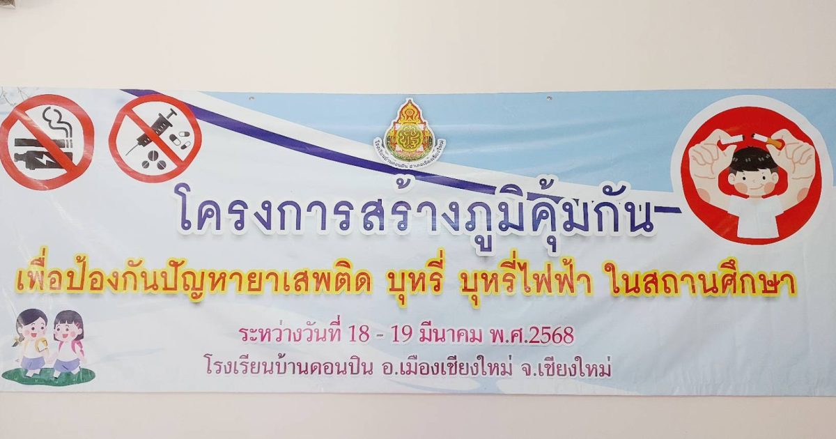มอบหมายให้ พ.ต.ต.กันย์กวีร์ กนกทิพยกุล สวป.(ชส.) สภ.เมืองเชียงใหม่ พร้อมกำลัง เข้าเป็นวิทยากรให้ความรู้ ตาม “โครงการสร้างภูมิคุ้มกันเพื่อป้องกันปัญหายาเสพติด บุหรี่ บุหรี่ไฟฟ้าในสถานศึกษา” ณ ห้องประชุมโรงเรียนบ้านดอนปิน ต.แม่เหียะฯ โดยมี นักเรียนชั้นประถมศึกษาปี่ที่ 4 – มัธยมศึกษาปีที่ 3 เข้าร่วมอบรม 138 คน