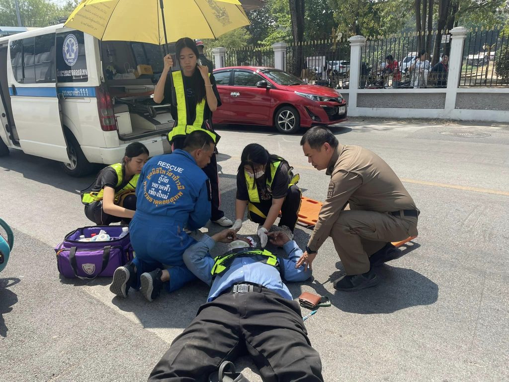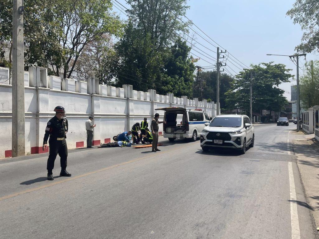วันที่ 11 มี.ค. 67 เวลา 13.00 น. พ.ต.อ.ปรัชญา ทิศลา ผกก.สภ.เมืองเชียงใหม่ ได้ออกตรวจในเขตพื้นที่รับผิดชอบ ในขณะกำลังเดินทางไปร่วมประชุม ได้พบเหตุ ว.40 จักรยานยนต์แฉลบล้มเอง บริเวณด้านหน้าค่ายกาวีละ ถ.เชียงใหม่-ลำพูน มีผู้ได้รับบาดเจ็บจำนวน 1 ราย มีอาการบาดเจ็บและเลือดออกบริเวณศรีษะ ผู้บาดเจ็บสามารถตอบโต้ได้เล็กน้อย จึงได้ร่วมกับเจ้าหน้าที่สารวัตรทหารค่ายกาวีละ อำนวยความสะดวกการจราจร กู้ภัยหยาดฟ้า 111 ให้การช่วยเหลือ เบื้องต้นผู้บาดเจ็บได้นำตัวส่ง รพ.ราชนิเวศ และได้ประสานสายตรวจเขต สภ.แม่ปิง และร้อยเวร60 รับรถจักรยานยนต์นำเก็บรักษาต่อไป
