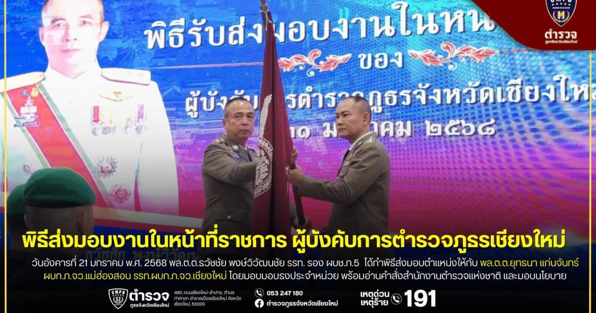 ต่อมาในเวลา 09.00 น. พล.ต.ต.ธวัชชัย พงษ์วิวัฒนชัย รรท.รอง ผบช.ภ.5 และ พล.ต.ต.ยุทธนา แก่นจันทร์ รรท.ผบก.ภ.จว.เชียงใหม่ ทำพิธีส่งมอบแฟ้มและธงประจำหน่วย จากนั้นได้ตรวจเยี่ยมและทักทายกำลังพลในแถว