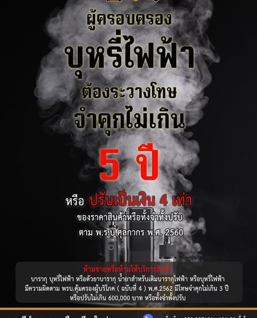 ขอแจ้งเตือนประชาชนเกี่ยวกับการสูบ นำเข้า จำหน่าย ครอบครองบุหรี่ไฟฟ้า ซึ่งถือเป็นความผิดตามกฎหมาย โดยมีโทษตาม พ.ร.บ. ศุลกากร พ.ศ. 2560 ดังนี้