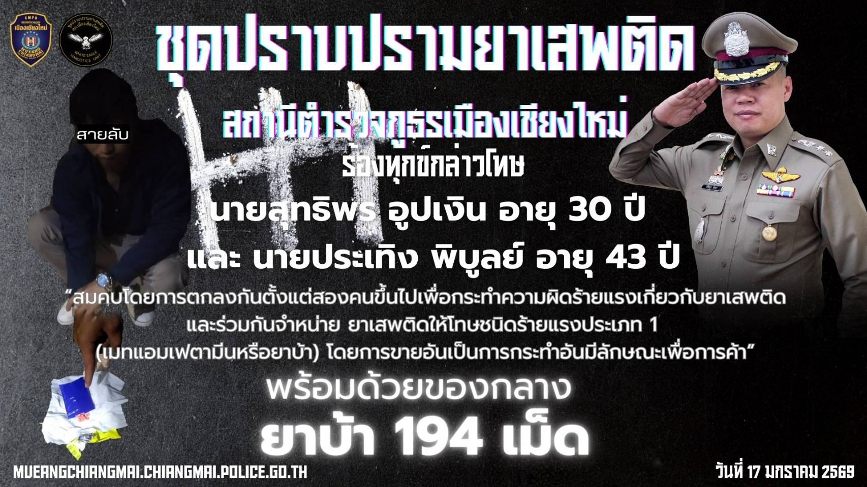13 ม.ค.2569 โดยการอำนวยการของพ.ต.อ.ปรัชญา ทิศลา ผกก.สภ.เมืองเชียงใหม่,พ.ต.ท.ทัตตวีย์ ด่านพิทักษ์ตระก